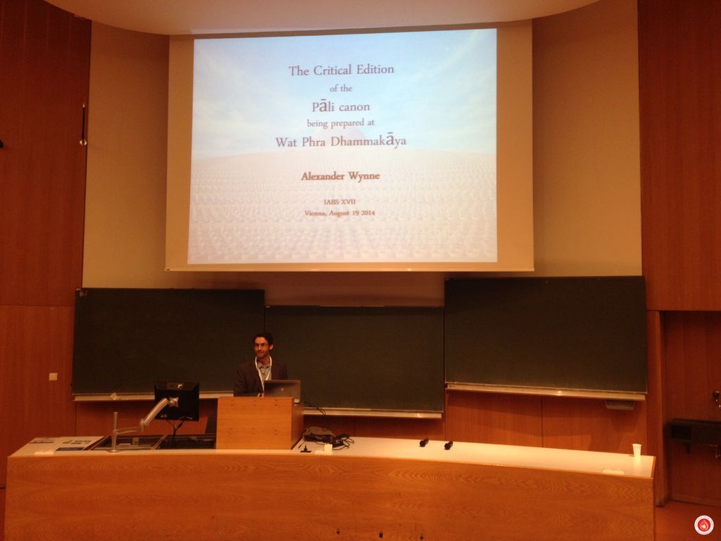 During the 17th Congress of the International Association of Buddhist Studies, held at the University of Vienna, Austria, Dr. Alexander Wynne delivered a lecture on 'The critical edition of the Pāli canon being prepared at Wat Phra Dhammakāya.' His presentation encompassed an overview of DTP's work, including manuscript digitization, computer programs, methods for selecting manuscripts, and the approach to creating a critical edition. Dr. Wynne also discussed the editorial policy established for the Tipiṭaka project as a whole.