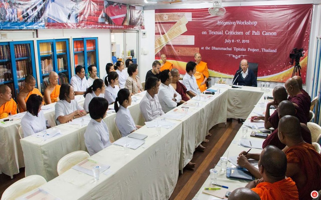 The Tipiṭaka Research Center (TRC) organized the inaugural "Intensive Workshop on Textual Criticism of the Pāli Canon" at the Dhammachai Tipiṭaka Project, Wat Phra Dhammakaya, Pathum Thani. This 10-day program featured Professor von Hinüber as a special guest. On the first day, Dr. Alexander Wynne provided an overview of DTP, emphasizing its goals and theoretical foundations. Dr. Bunchird Chaowarithreonglith discussed manuscript digitization and metadata, while Dr. Suchada Srisetthaworakul presented information technology programs and future plans for online access. From July 9th to 16th, researchers from Thailand, Myanmar, and Sri Lanka covered various topics, including manuscript repositories, scribal issues, manuscript selection, and philological problems. On July 16th, Professor von Hinüber delivered a special lecture on "The Verb Form addhabhavi as a Text Critical Problem."