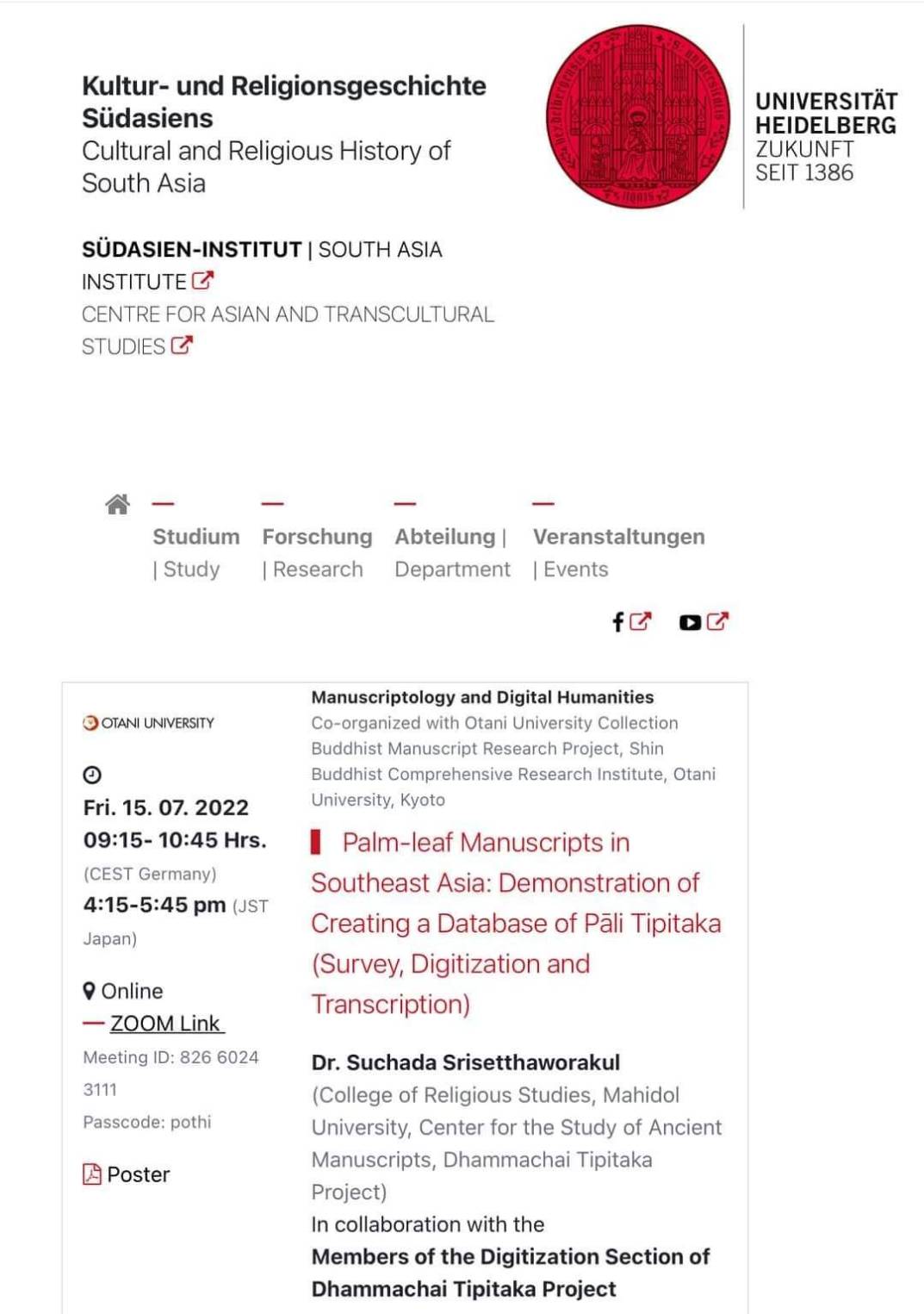 Universität Heidelberg, Germany in collaboration with Otani University, Japan organized a joint research group with the aim to review and revise the study of South and Southeast Asian manuscripts in the context of the fast-evolving discipline of Digital Humanities. On Friday, July 15, 2022, from 02.15-3.45 pm, Dr. Suchada Srisetthaworakul, Mahidol University in collaboration with the members of Dhammachai Tipiṭaka Project, gave a presentation on “Palm-leaf Manuscripts in Southeast Asia: Demonstration of Creating a Database of Pāli Tipiṭaka (Survey, Digitization and Transcription)”. The presentation demonstrated the process of creating a database of palm-leaf manuscripts of the Pāli canon conducted by Dhammachai Tipiṭaka Project (DTP), Thailand.