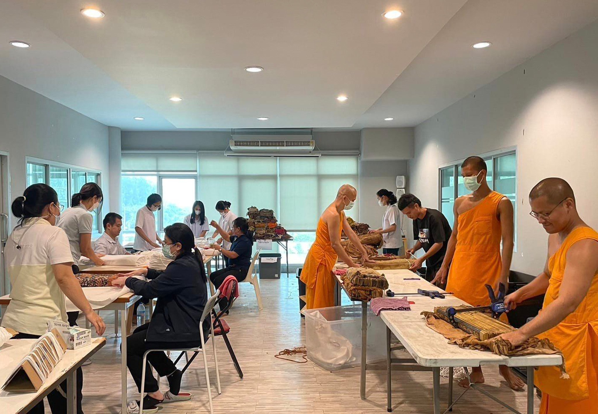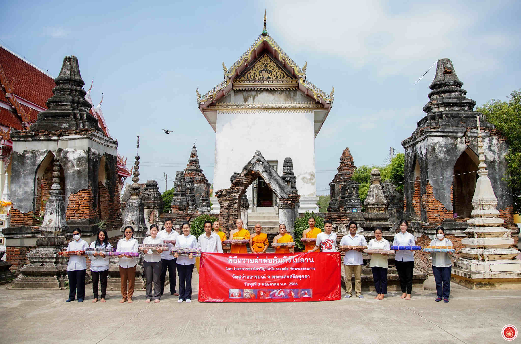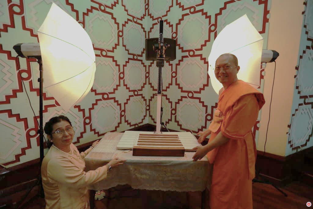 DTP staff members and students from Phranakhon Si Ayutthaya Rajabhat University participated in a ceremony to offer manuscript wrapping cloths to the monastic community of Thongpu Temple in Ayutthaya. These new cloths were intended to replace the old ones, which had been damaged by the great flood in 2011, in order to safeguard the precious writings from potential harm caused by light and dust.