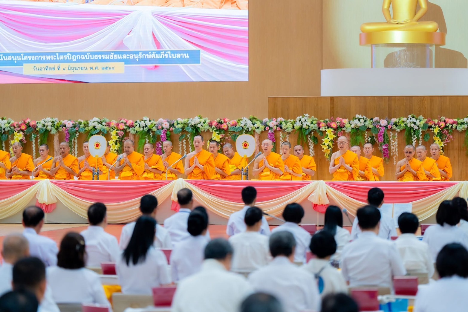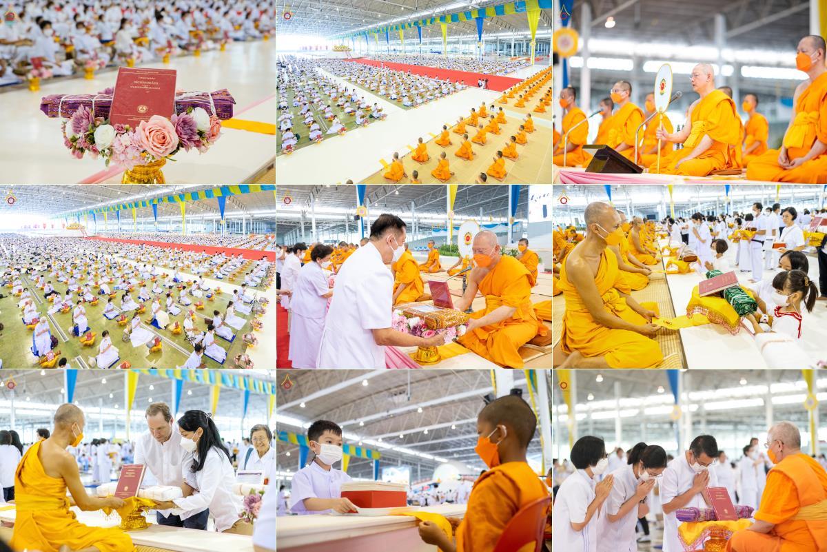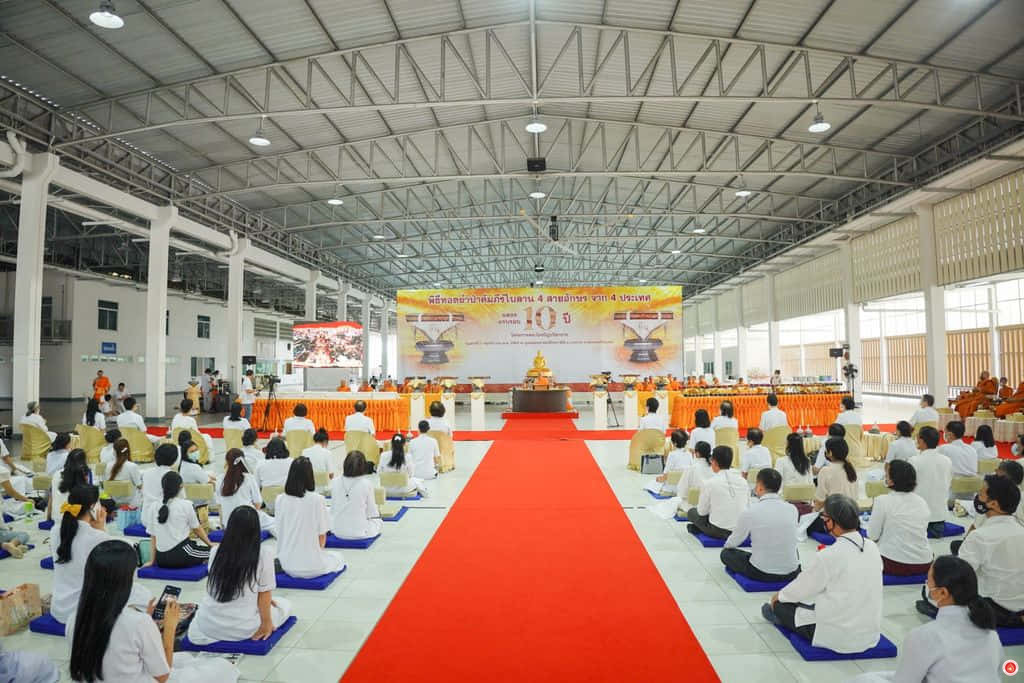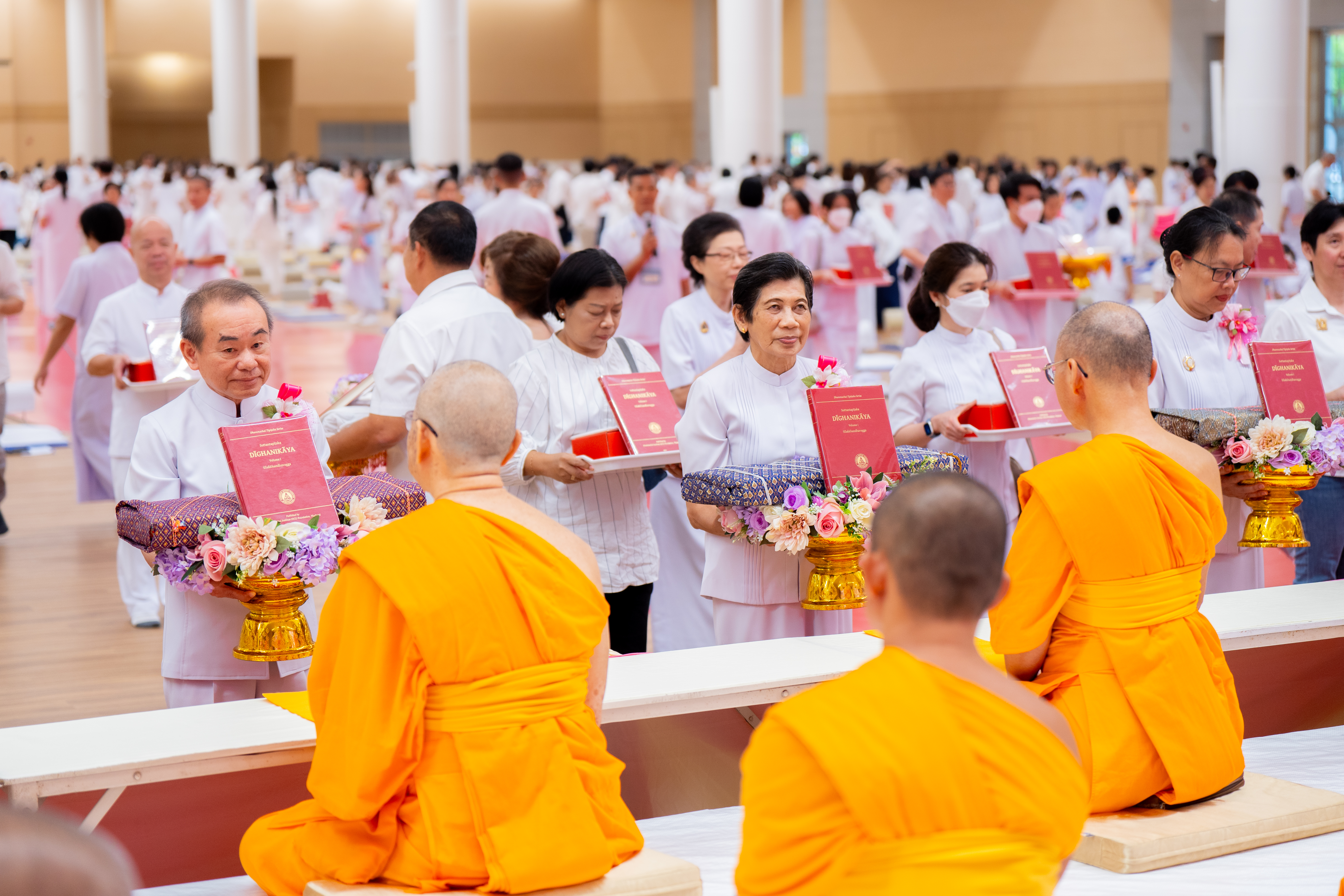 In a grand gathering at the Dhammakaya Assembly Hall, thousands of lay supporters came together to offer the critical edition of the Pali canon known as the Dhammachai Tipiṭaka Series to the monastic community. The event commenced with a period of meditation, followed by the formal Pali canon offering ceremony. To conclude, the presiding monk led the assembly in making resolutions and spreading loving-kindness.
