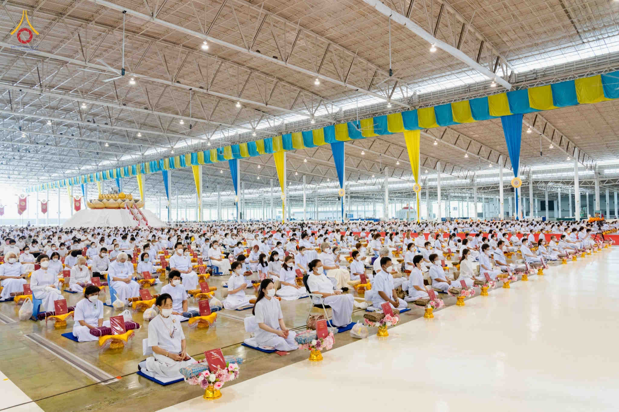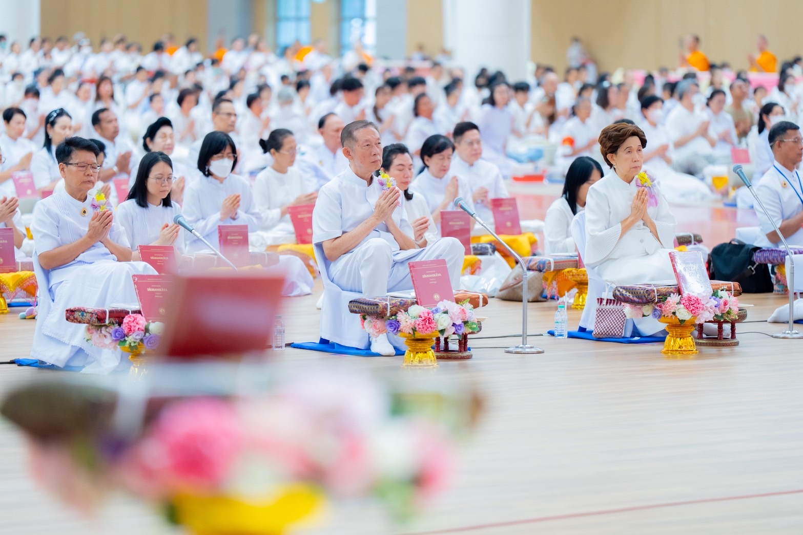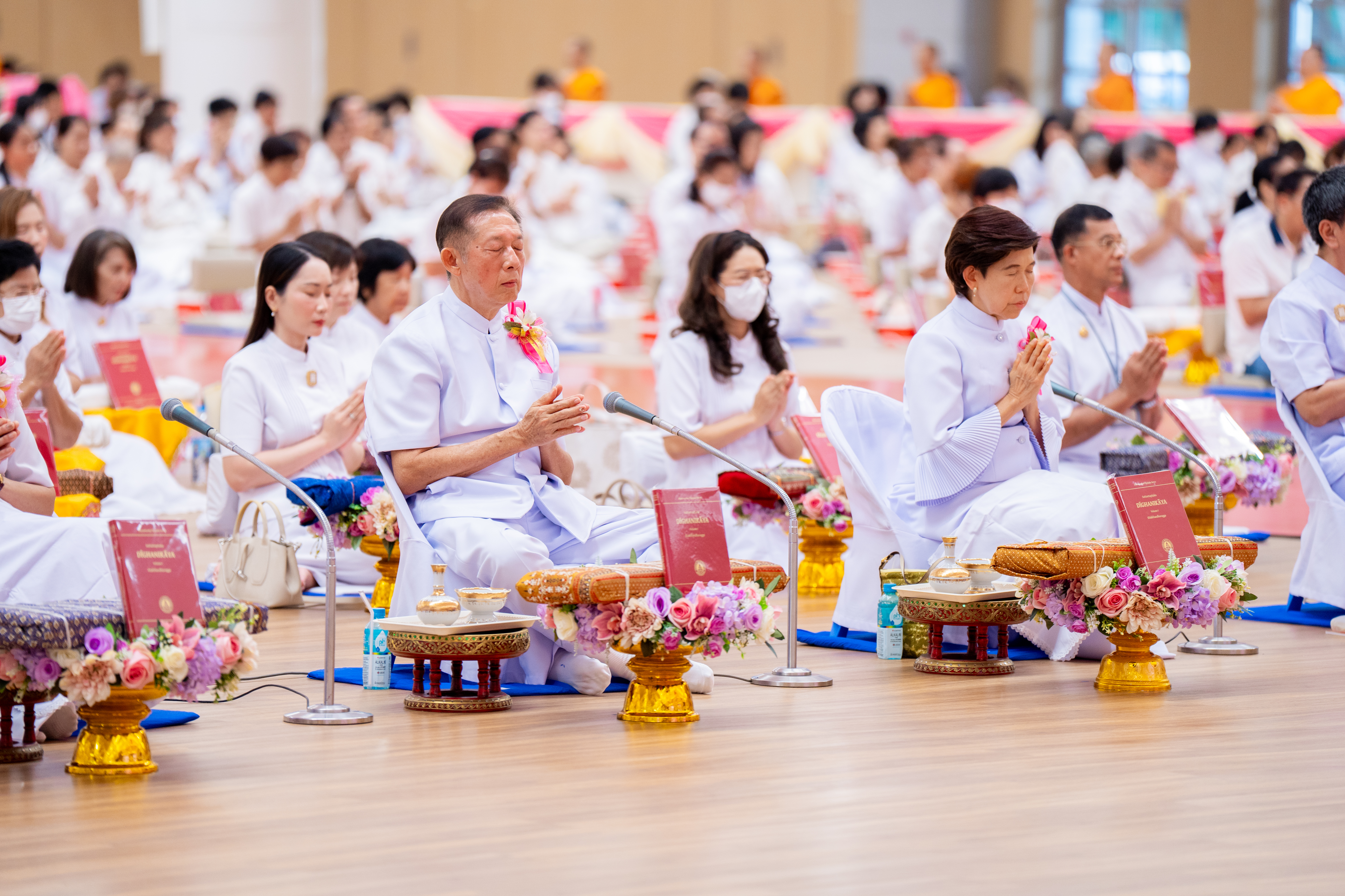 In a grand gathering at the Dhammakaya Assembly Hall, thousands of lay supporters came together to offer the critical edition of the Pali canon known as the Dhammachai Tipiṭaka Series to the monastic community. The event commenced with a period of meditation, followed by the formal Pali canon offering ceremony. To conclude, the presiding monk led the assembly in making resolutions and spreading loving-kindness.