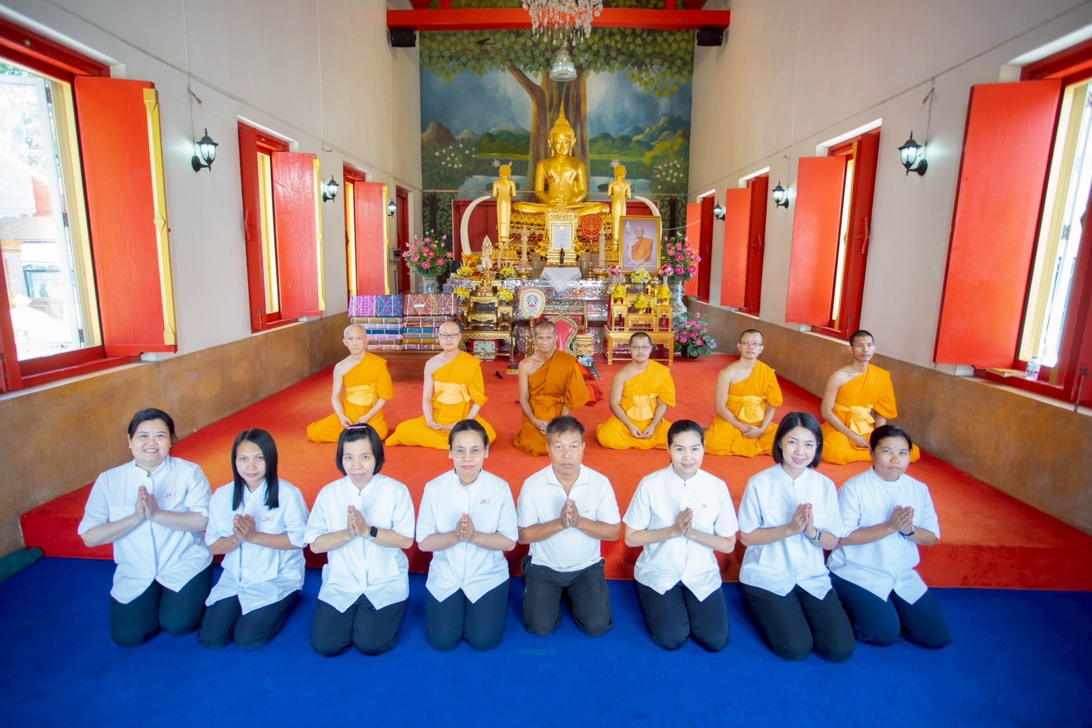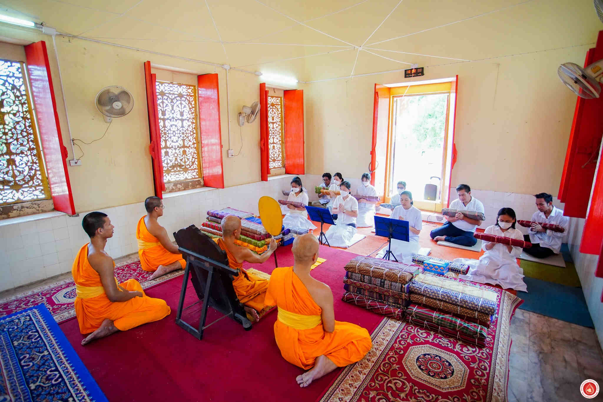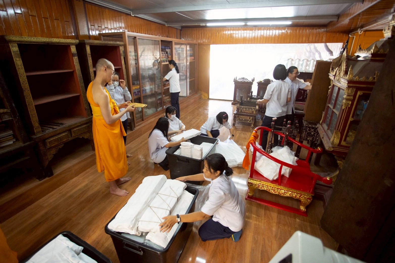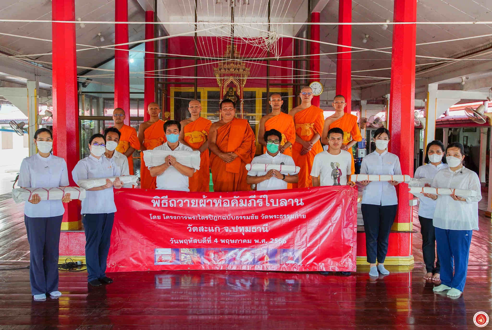 Monks and lay staff from DTP assembled at Sakae Temple to present manuscript wrapping cloths as offerings. The event commenced with a three-round procession of circumambulation, followed by the presentation of manuscripts wrapped in fresh white cloths atop the originals. Lastly, all participants enthusiastically joined in storing the manuscripts in cabinets.