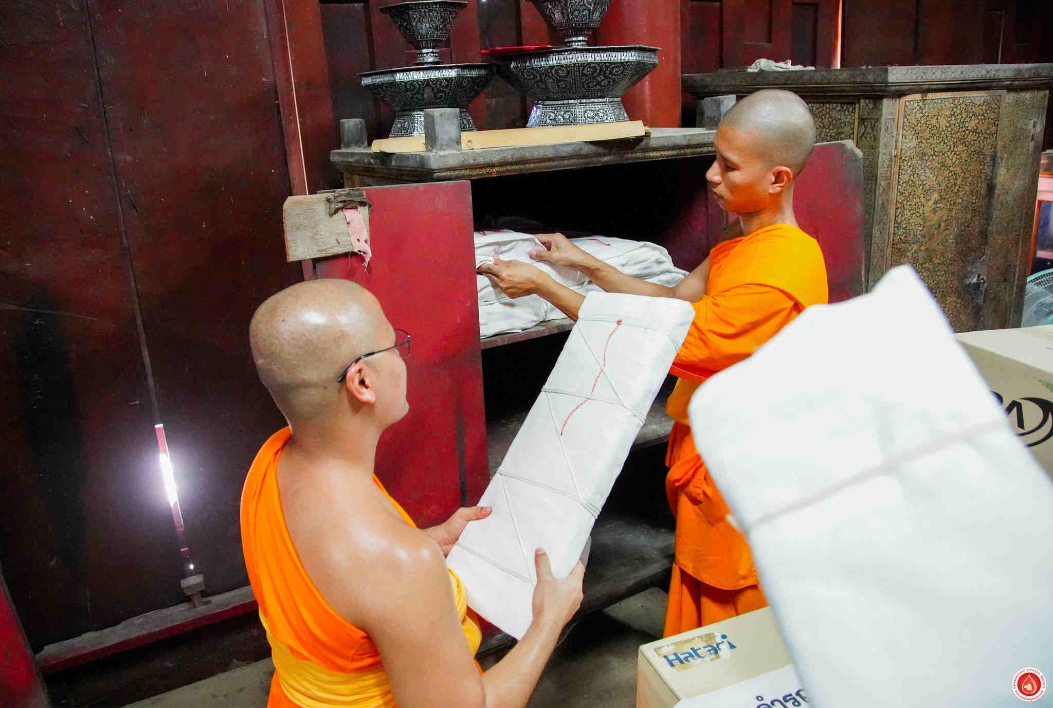 In a solemn ceremony, monks and lay staff from DTP gathered at Tong Pu Temple to return the manuscripts to their original repository. A few months earlier, DTP staff had discovered that the manuscripts’ old cloth wrappings had deteriorated with time. The staff replaced them with clean new wrappings, and through the kind generosity of the abbot, these newly wrapped bundles were permitted to be offered as alms during the Dhammachai Tipiṭaka Series Offering Ceremony held on June 8, one day before the manuscripts were returned. This occasion served as an official and sacred act of offering manuscript wrapping cloths carried out by the lay community.