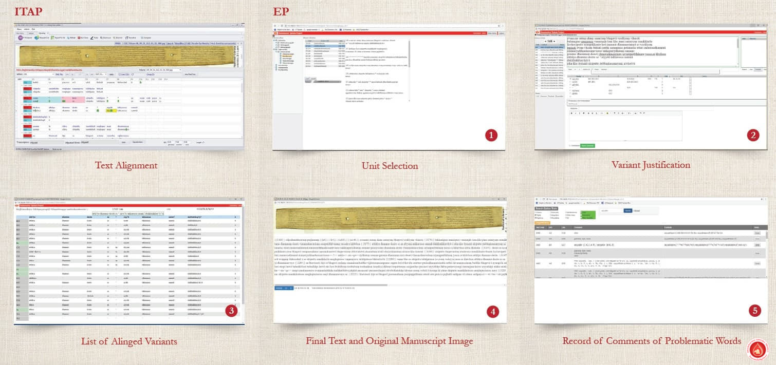 The ITAP program analyzes the transcribed data sourced from ODEM and generates a comprehensive synoptic table. This table serves as a resource for researchers well-versed in linguistics, archaeology, and Buddhist studies, enabling them to meticulously review, align, and validate the entire dataset. Should they identify instances where certain clusters of words could be disentangled, they will diligently explore opportunities for revision and realignment.